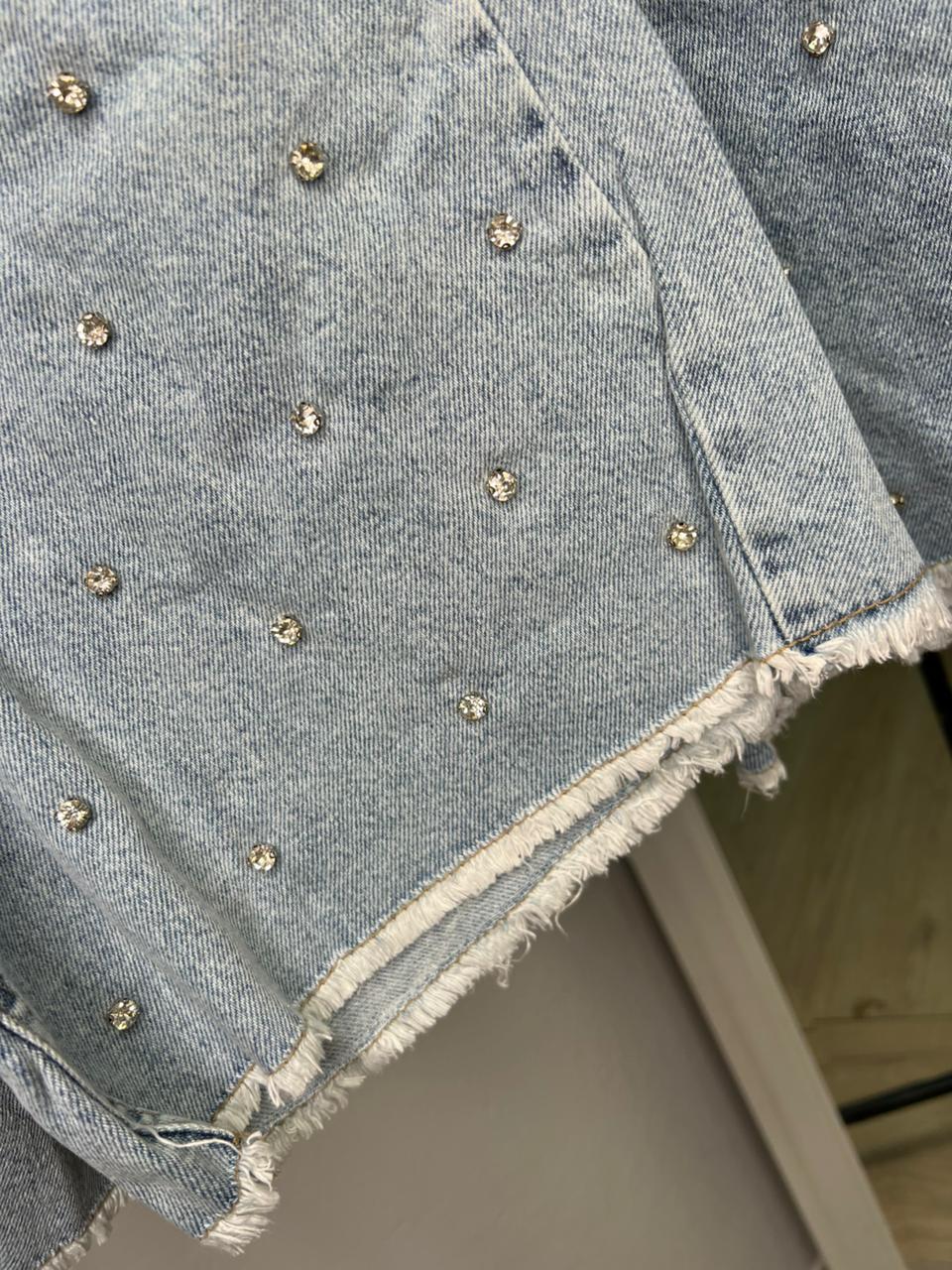Το Sparkle Denim Shorts συνδυάζει την cool αισθητική των jorts (μακριά σορτς) με τη λάμψη των διακοσμητικών strass, δημιουργώντας ένα look που ξεχωρίζει από το πρωί ως το βράδυ.